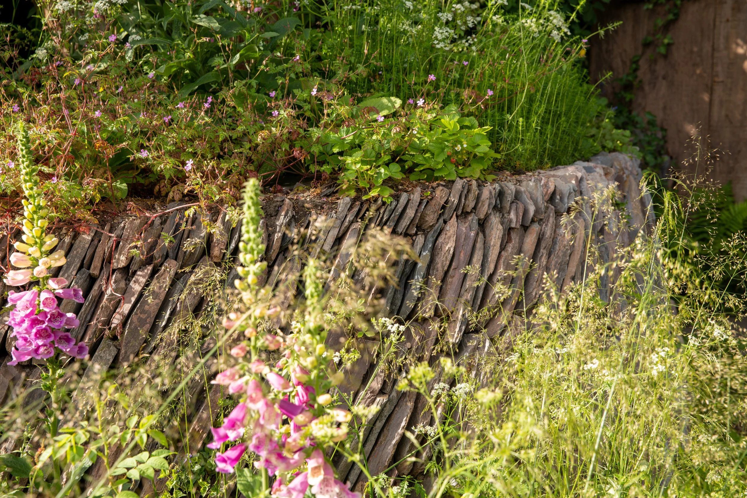 A flowing Brook runs over our Exmoor Scree, past a beautiful curved traditional Exmoor Slate Wall and dances playfully through the natural Weathered Exmoor Stepping stones & Rockery.