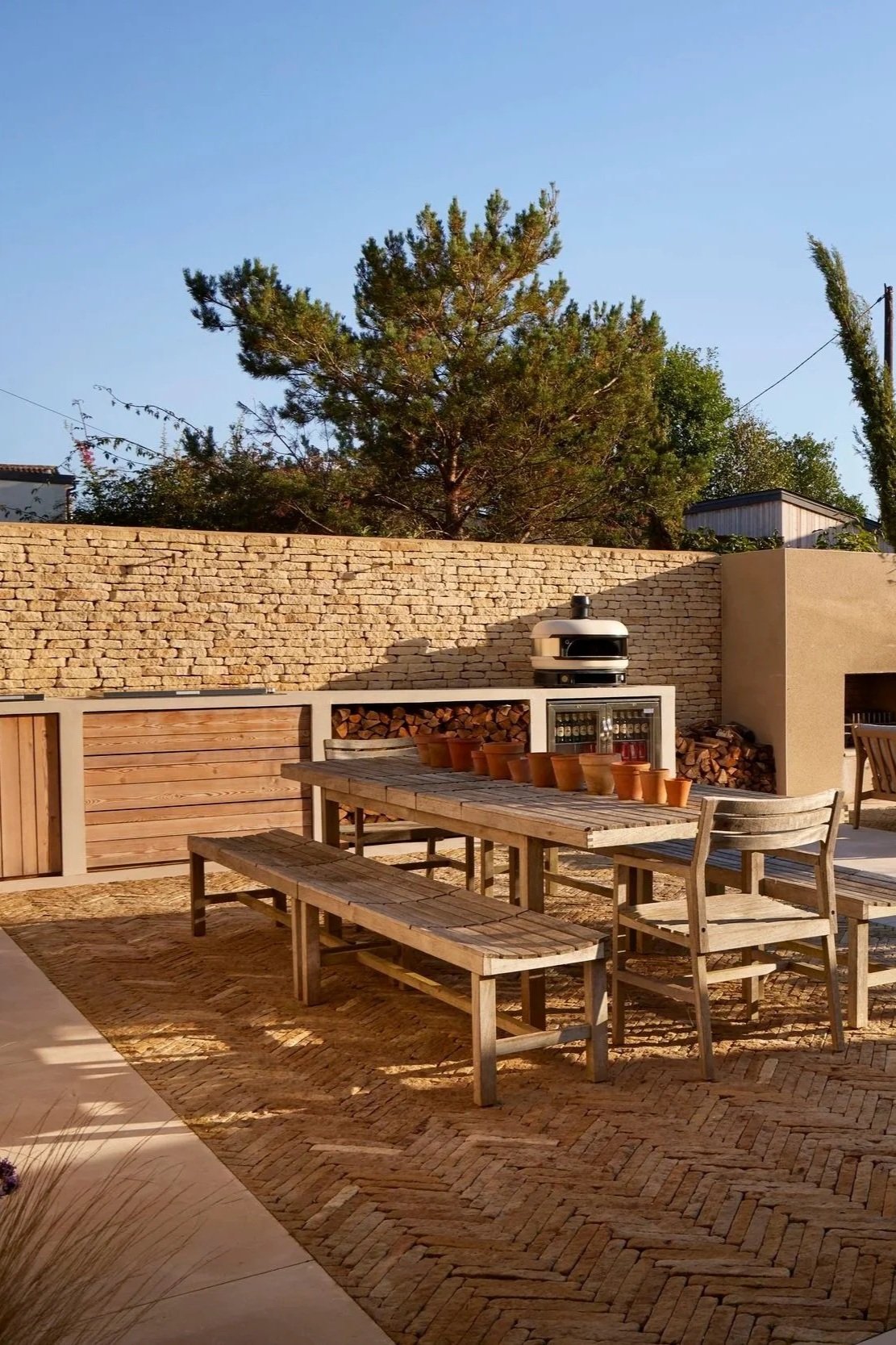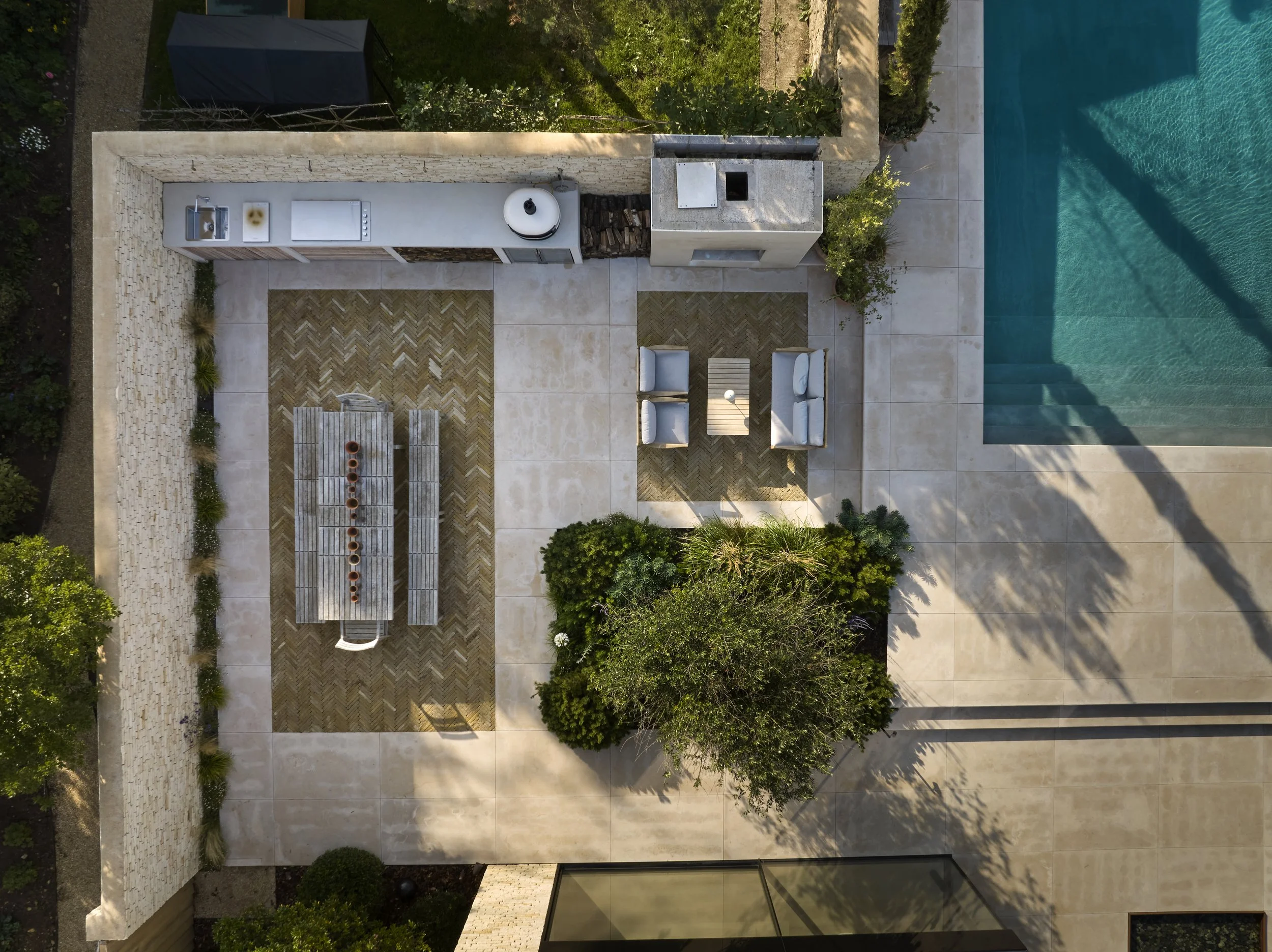 Beneath the dining table, a woven rug of bespoke Luciano Pitchers brick introduces warmth and texture to the terrace. Laid in a gentle herringbone pattern, it subtly breaks the expanse of paving while anchoring the space around the outdoor kitchen and dining area.
